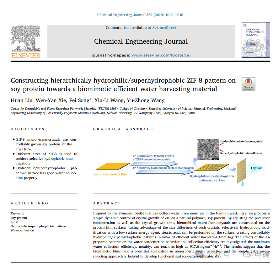 Constructing hierarchically hydrophilic/superhydrophobic ZIF-8 pattern on soy protein towards a biomimetic efficient water harvesting material(在大豆蛋白上构建层次化的亲水/超疏水ZIF-8图案,以制备仿生高效集水材料)