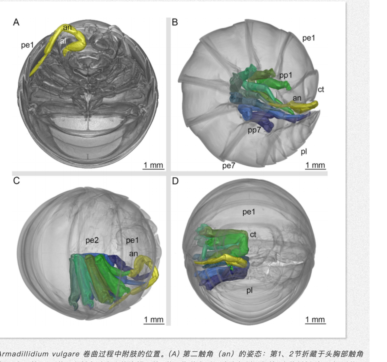图10. Armadillidium vulgare 卷曲过程中附肢的位置。(A) 第二触角(an)的姿态:第1、2节折藏于头胸部触角叶(al)下方,第3、4节压入触角叶上方的沟槽,第5节及鞭节向后沿头胸部侧面与第1胸节侧板(pe1)延伸;(B–D) 卷曲个体触角与步足的位置:侧面观(B)、背面观(C)及前面观(D);ct = 头胸部;pe1、pe2、pe7 = 第1、2、7胸节;pl = 腹节;pp1、pp7 = 第1、7步足。