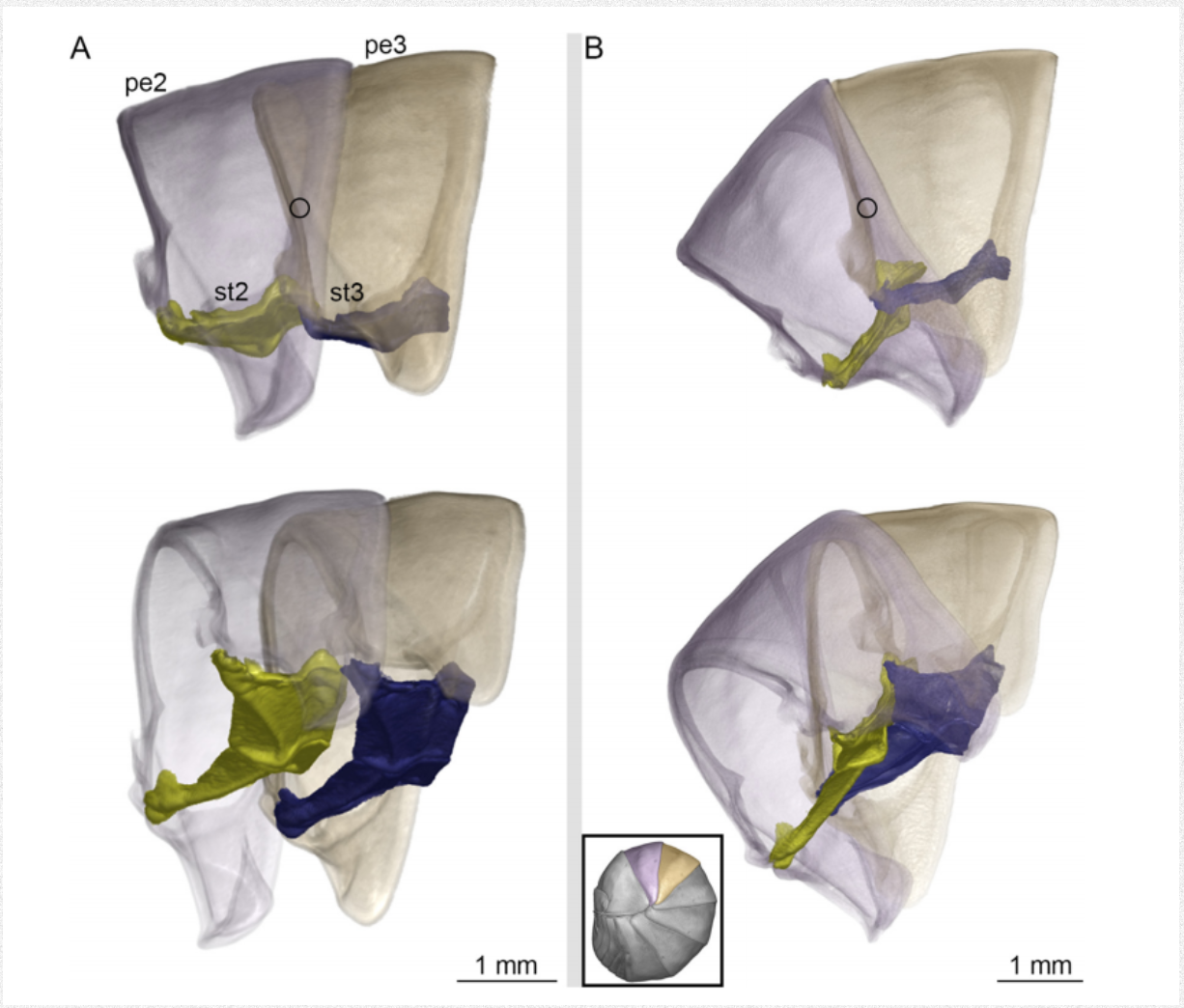 Neoscan CT 的三维重建显示,步足在卷曲过程中的摆放具有高度固定且精巧的模式。步足的基节被压入由胸腹板重叠形成的足沟中,中间几节外展,而末端节(propodus、dactylus)大多呈近垂直姿态贴合身体侧面。这样的三维布局兼顾了紧凑性与不受压损伤,为构成球体内部的空间结构提供了合理解释。