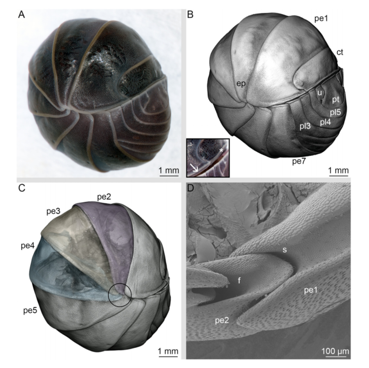 图1. Armadillo officinalis 的卷曲行为。(A) 活体 A. officinalis 个体卷成紧密球形的照片,附肢被隐藏。(B) 通过显微 CT 获取的、快速冷冻个体的三维重建图。可以看到胸节侧板(ep)彼此重叠;尾节(pt)、尾肢基节(u)以及第 5 腹节的侧板(pl5)贴靠在头胸甲(ct)上;而第 3、4 腹节的侧板(pl3、pl4)以及第 7 胸节(pe7)的侧板则压靠在第 1 胸节(pe1)的侧板上。插图:第 1 胸节侧板上的侧缘沟槽(箭头)以及头胸甲前缘的沟槽(星号),这些结构用于容纳身体后部的边缘。(C) 显微 CT 显示,第 3–5 胸节(pe3–pe5)的侧板前角嵌入第 2 胸节(pe2)后侧的沟槽内。(D) 第 1、2 胸节侧板的特化结构:第 1 胸节上的裂沟(schisma, s)以及第 2 胸节上的后侧沟槽(g)。