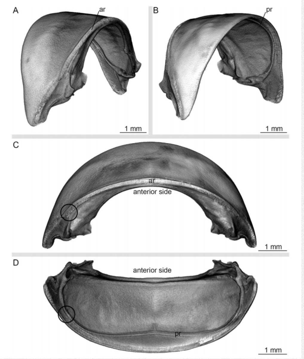 图2. Armadillo officinalis 胸节背板(pereon tergites)的形态,以第 3 胸节背板为例进行展示:(A) 前外侧视图:在背板前缘可以看到一条前嵴(ar)。(B) 后外侧视图:背板沿其后缘向自身方向折叠。在背板与关节膜(arthrodial membrane)的连接处,有一条贯穿背板的后嵴(pr)。(C) 前背侧视图:可见整个前嵴(ar)。卷曲过程中,该嵴与前一节背板接触的位置为图中圆圈所标示的凹陷处。(D) 腹侧视图:图中圆圈标示的是后嵴(pr)上供下一节背板旋转的关键接触点。