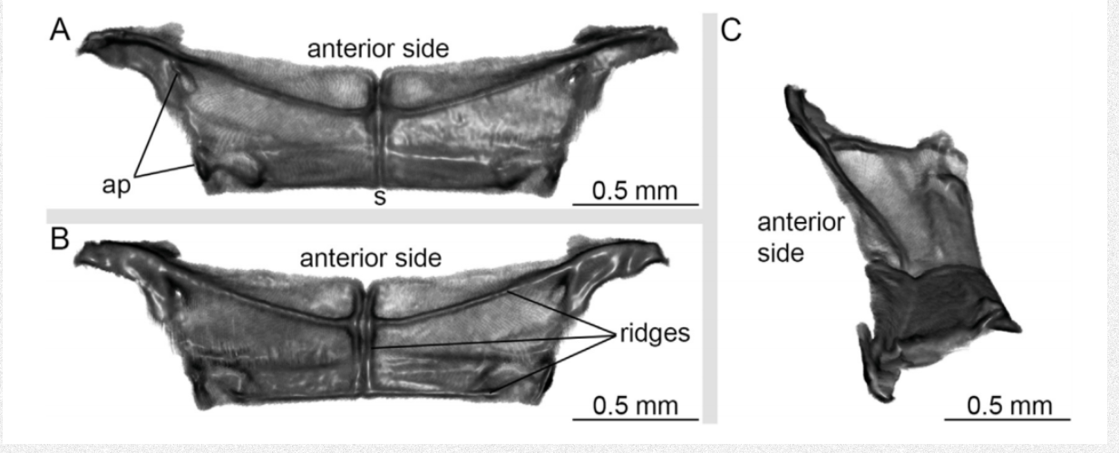 图3. Armadillo officinalis 胸节腹板(sternite)的形态。图示第 3 胸节腹板:(A) 背视图:腹板前缘较宽,中间沿中线具一条缝合线(s),两侧近外缘处各有一对内突(ap);(B) 腹视图:可见成对的脊状隆起;(C) 背侧斜视图:腹板整体呈复杂立体形态,其边缘向背方延伸的程度大于中间区域。