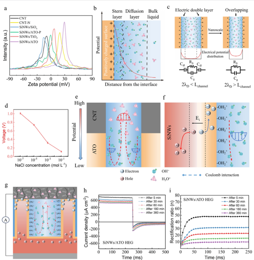zeta 电位测试显示(如图 2a),原始 CNT 和 SiNWs/SiOₓ带负电,而 SiNWs/ATO 带强正电(+29.9 mV),二者形成的纳米流体离子二极管使 OH⁻富集于 SiNWs/ATO 通道、H₃O⁺ 积累于 CNT 膜,形成叠加的纵向静电场,强化离子定向输运。低离子浓度下德拜长度更大,离子整流效率更高,NaCl 浓度升高会导致器件电压大幅下降。