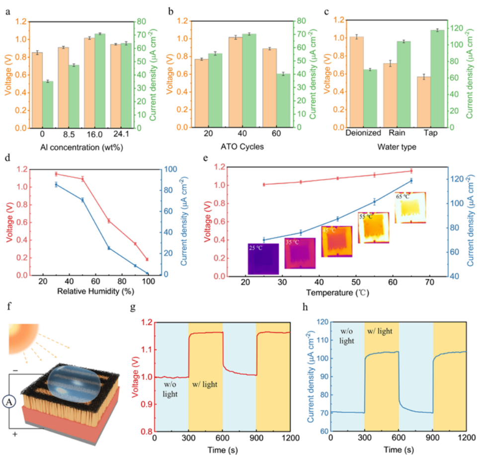 研究确定了器件最(zui)优工艺参数:Al 掺杂浓度 16.0 wt%、ATO 层厚度 4.9 nm。环境因素对器件性能影响显著,低湿度、高温更利于输出,温度升至 65℃时短路电流密度增至 118.7 μA・cm⁻²;标准 AM 1.5 光照下,器件产生光伏效应,实现水伏 - 光伏双模式能量收集,开路电压升至 1.16 V、短路电流密度达 103.4 μA・cm⁻²(如图 4)。