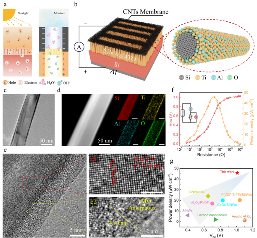 图 1 器件设计原理、结构和电性能。(a)p-n 结光伏效应与纳米流体离子二极管整流效应的类比;(b)SiNWs/ATO HEG 器件结构示意图;(c)SiNWs/ATO 的 TEM 图;(d)SiNWs/ATO 的 EDX 元素映射图;(e)SiNWs/ATO 的 HRTEM 图及局部放大图;(f)输出电压和功率密度随外负载的变化;(g)本研究 HEG 与文献报道 HEG 的性能对比